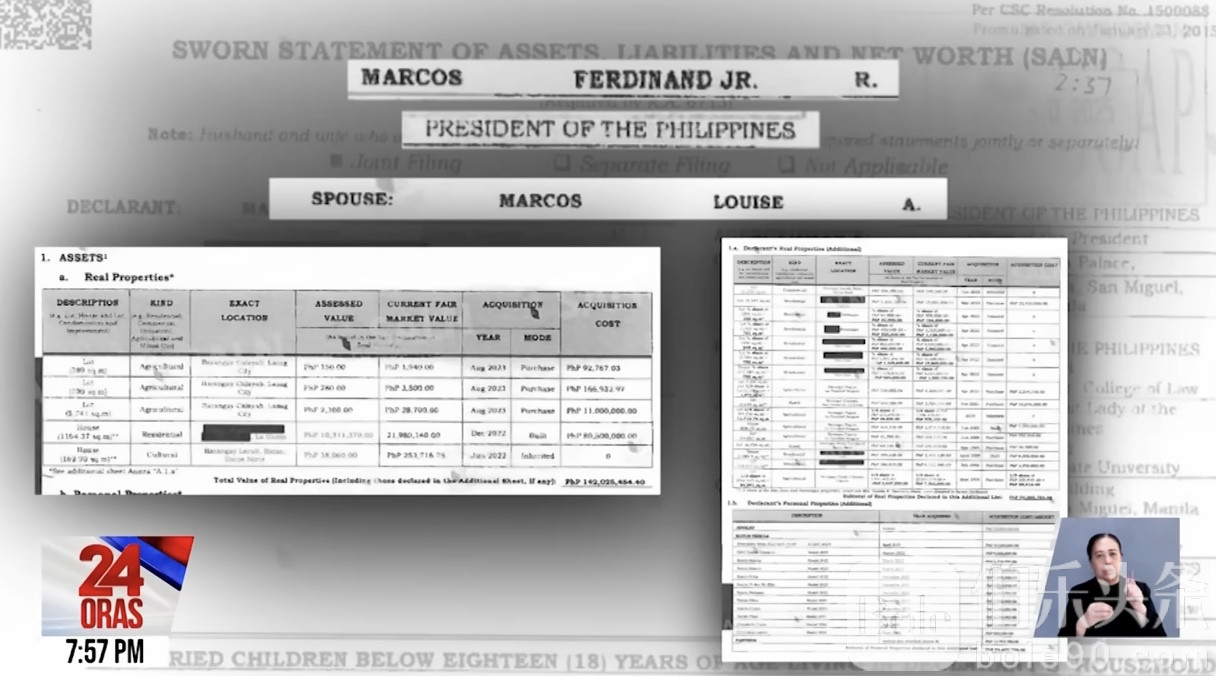 伯乐头条专讯:菲律宾总统小费迪南德·马科斯(Ferdinand R. Marcos Jr.)最新财产申报(SALN)显示,截至2024年12月31日,他的净资产超过3.89亿披索。而根据私人评估公司Cuervo Appraisers, Inc.的估值,他的资产总额高达13.75亿披索。