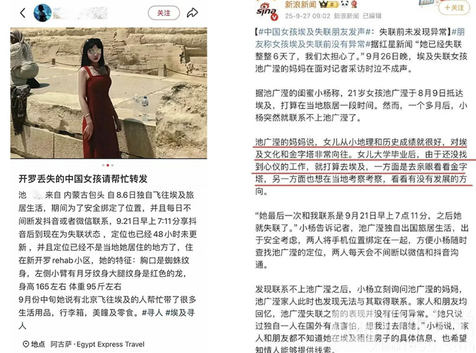 · 2025年8月,这名女子以“考察金字塔文化 + 工作机会”的名义赴埃及,其母亲和闺蜜称,她热爱历史、地理,对埃及充满兴趣。