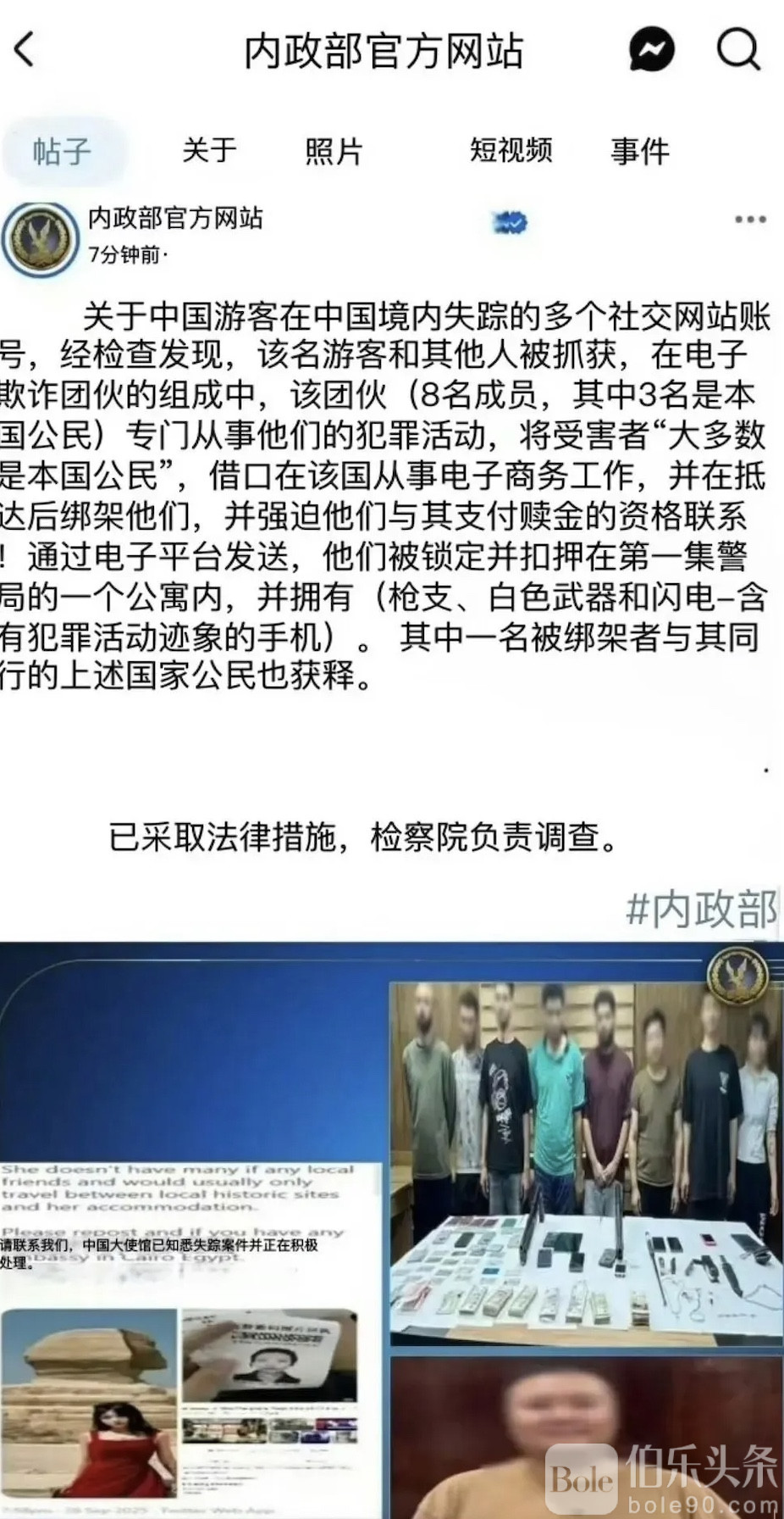 · 9月30日,埃及内政部通报:她是一个 8 人电诈团伙成员,该团伙以电商工作为幌子,诱骗大多数是中国公民到埃及,之后进行绑架,逼迫与家人联系支付赎金。