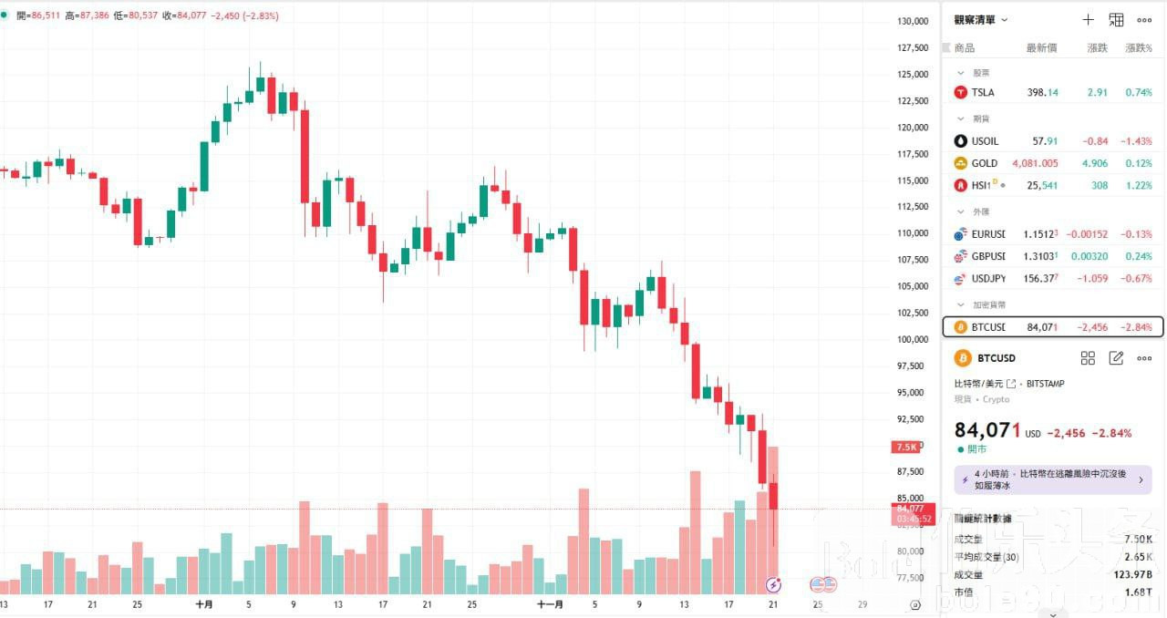 伯乐头条专讯:近期比特币价格持续大幅波动,引发市场高度关注。数据显示,比特币一度接近 8 万美元关口,多名业内投资者与币圈大佬正在观望,寻找入场抄底的时机。分析人士指出,价格短期下跌可能与全球加密货币市场流动性紧缩以及投资者风险偏好下降有关。