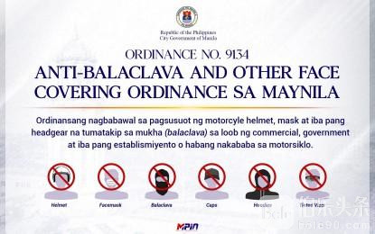伯乐头条专讯:马尼拉市政府近日宣布全面禁止在公共场所佩戴遮挡面部的头饰,包括头盔、口罩、巴拉克拉瓦帽、连帽衫、帽子及有色面罩等。新规适用于政府机关、商场及所有公共区域,除非存在特殊必要情形。
