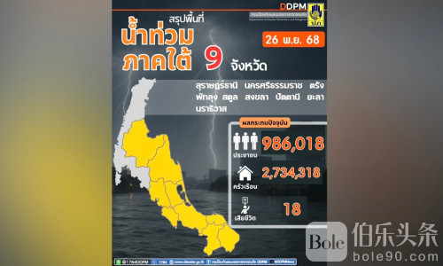 伯乐头条专讯:泰国灾情持续升温,官方通报南部九省洪水仍未退去,已造成18人死亡,累计受影响家庭高达986,018户,当局正全面加速救援,与此同时北部及中部十一省的昭披耶河流域水位已逐渐回落。