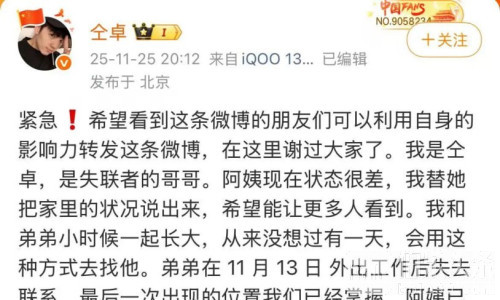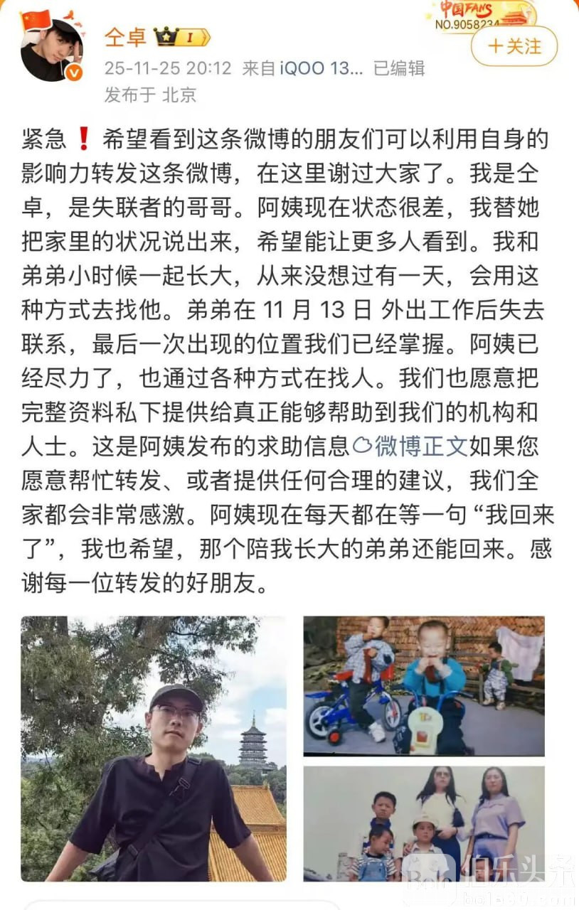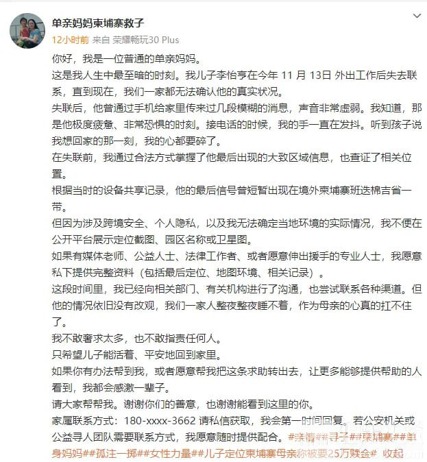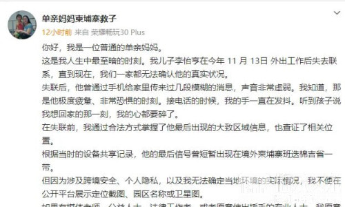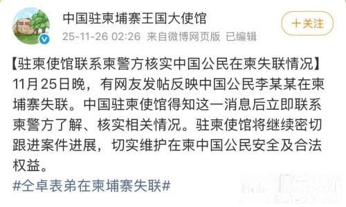 伯乐头条专讯:近日,一起涉及中国公民在柬埔寨失联的事件引发广泛关注。中国驻柬埔寨大使馆11月26日凌晨发布通报,确认正在就相关情况向柬方警方核实并持续跟进案件进展。演员仝卓在11月25日晚通过社交平台发文求助,称表弟李怡亨于11月13日外出打工后失联,多日联系不上。当事人的母亲亦通过社交媒体账号“单亲妈妈柬埔寨救子”发声,表示儿子在离家后再无消息,目前一家人无法确认其具体处境。