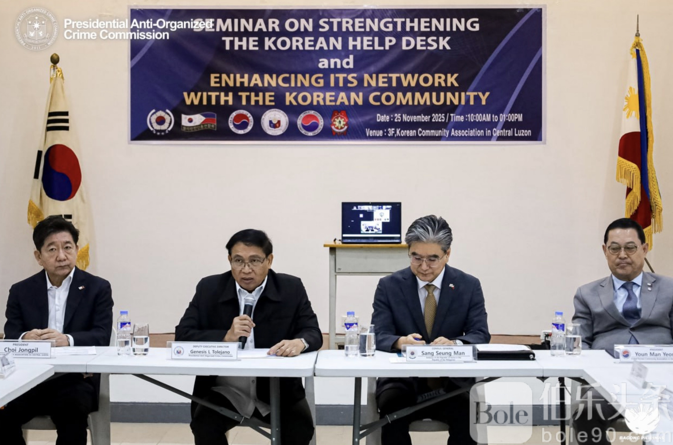 伯乐头条专讯:韩国驻菲律宾大使馆近日携手安赫莱斯市警察局与菲律宾总统反有组织犯罪委员会(PAOCC),共同推动“韩国协助服务台”升级,全面强化在菲韩国侨民的安全与协作体系。11月25日,三方在中央吕宋韩国社群协会大楼举办专题研讨会,多方韩国社群领袖与菲方官员齐聚一堂,深化治安与服务合作。