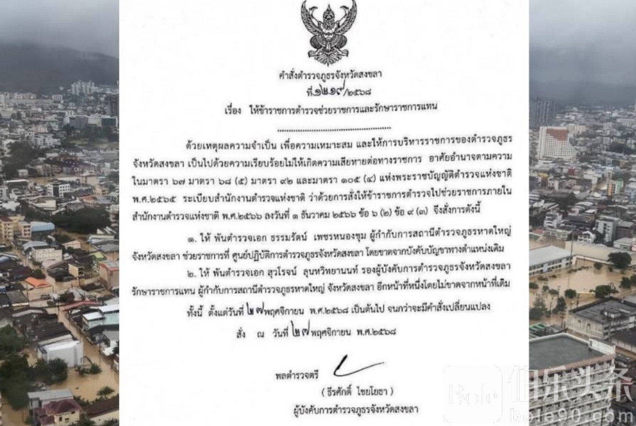 伯乐头条专讯:泰国南部连日暴雨引发大规模洪灾,官方27日深夜突然下令调整警界关键岗位:哈亭(Hat Yai)警察局长被紧急调离原职,并由省警副指挥官火线接任,事件迅速引发社会关注。
