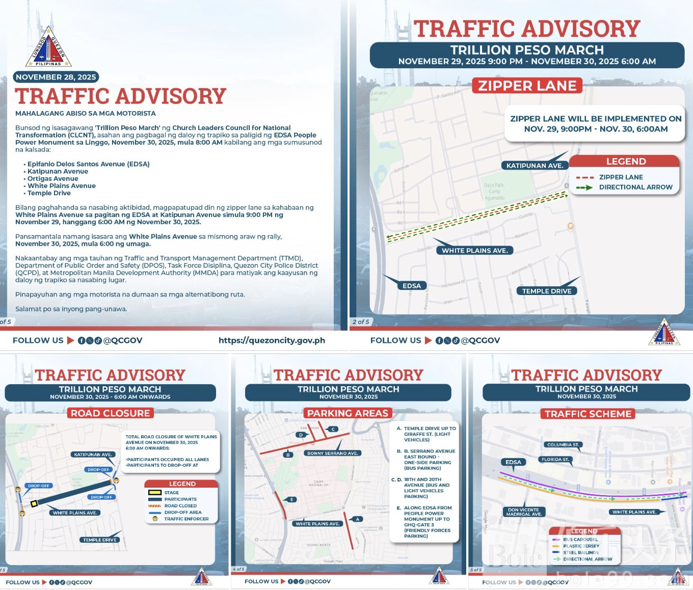 - White Plains 大道:11 月 29 日早 9 点起设 “拉链车道”(仅临时分流),11 月 30 日早 6 点起全面封死(EDSA 至 Katipunan 段);