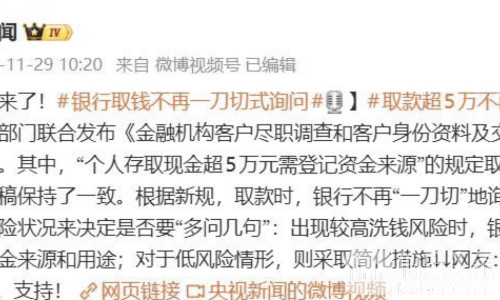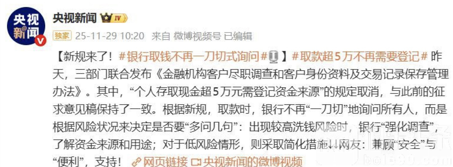 伯乐头条专讯:中国人民银行、国家金融监督管理总局及中国证监会于11月28日联合发布《金融机构客户尽职调查和客户身份资料及交易记录保存管理办法》,自2026年1月1日起施行,明确取消“个人存取现金超过5万元需登记资金来源”的规定。这意味着广大低风险客户,如领取养老金的群体,将在银行办理现金存取业务时,只需核实身份,无需额外说明资金来源,极大提升金融服务便利性。