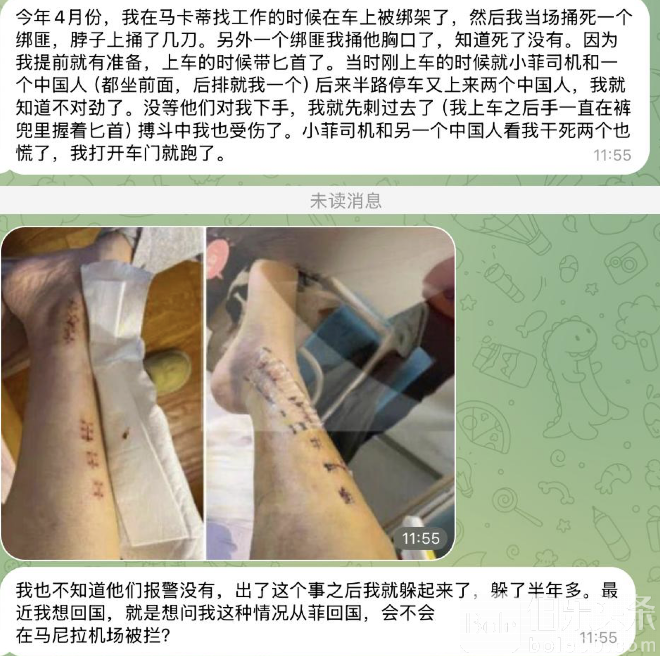 伯乐头条专讯:一名中国男子日前在网上自述,自己今年4月于菲律宾马卡蒂市找工作时意外遭遇绑架,并在车内反击刺死至少一名绑匪。如今潜伏数月后准备回国,却担心在马尼拉机场被拦,引发舆论关注。
