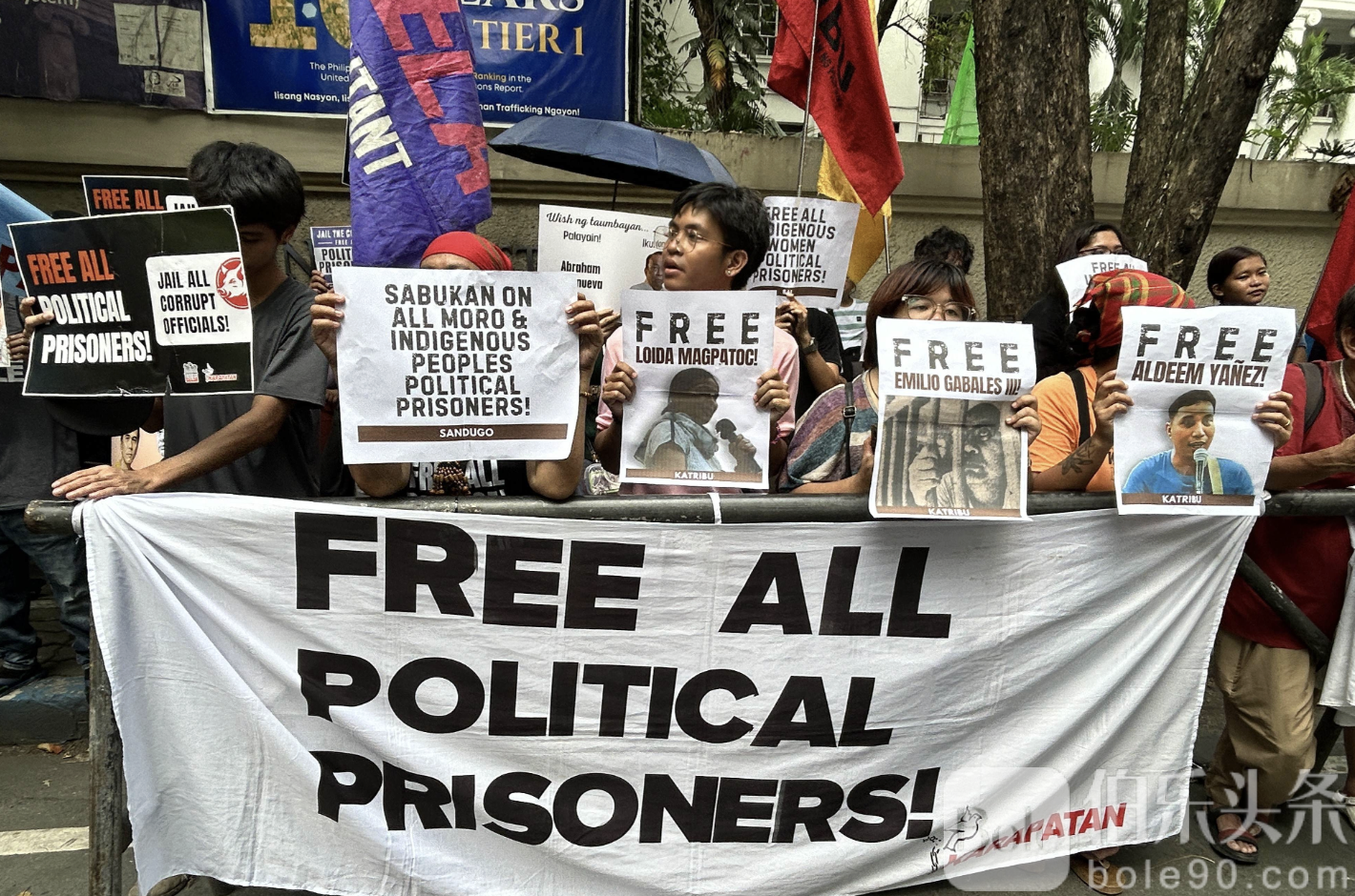 伯乐头条专讯:菲律宾两大人权组织——“菲律宾人权联盟”(Karapatan)与“反拘押及逮捕前囚者协会”(SELDA),3日早上在司法部大楼前发动抗议,要求政府立即释放全国 696 名政治犯,并严查涉嫌贪腐的官员,场面引发社会关注。