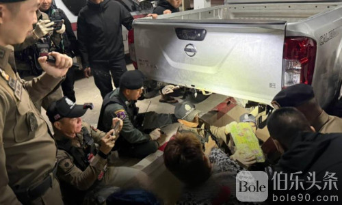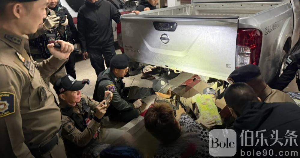 伯乐头条专讯:泰国警方在清莱省设卡拦查一辆看似普通的皮卡,却意外从底盘暗格中挖出重达54公斤的冰毒,两名嫌疑人当场落网,警方正全力追查幕后毒枭指挥链