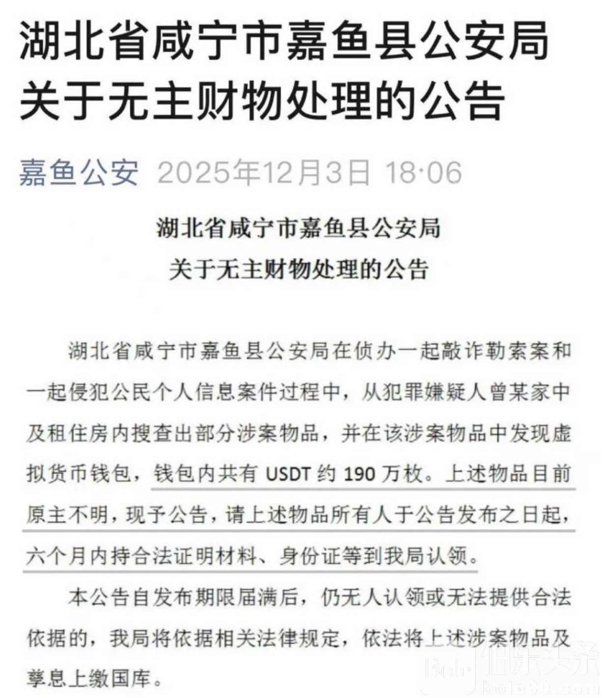 伯乐头条专讯:湖北省咸宁市嘉鱼县公安局近期在侦办一起诈骗及侵犯公民个人信息案件时,从涉案嫌疑人住所和租住房内查获大量涉案物品,其中包括一只虚拟货币钱包,内含约190万枚USDT。