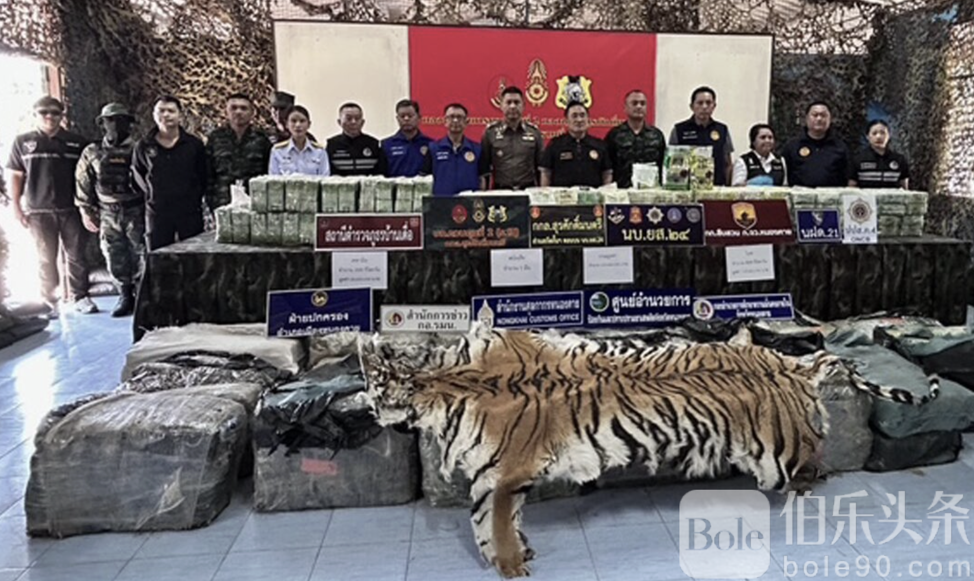 军方表示,该辆货车从抽水站附近驶出,路线与情报吻合。行动小组随即跟踪并在东文村路口成功拦截。车厢内塞满贴有“茶叶”图案的塑料包,共装载 27 袋毒品以及一张完整虎皮,疑与非法野生动物走私有关。