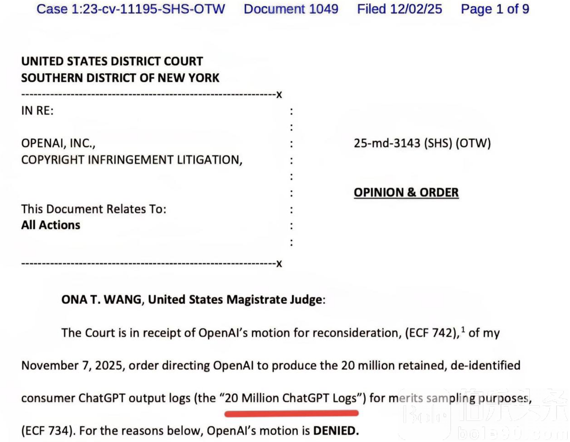 伯乐头条专讯:美国司法界近日掀起轩然大波,一名联邦法官裁定人工智能公司 OpenAI 必须向法院提交超过 2,000 万条用户与 ChatGPT 的对话记录,作为一宗持续审理中的诉讼证据。这项命令不仅规模罕见,更瞬间引爆外界对 AI 时代隐私安全的担忧。