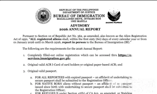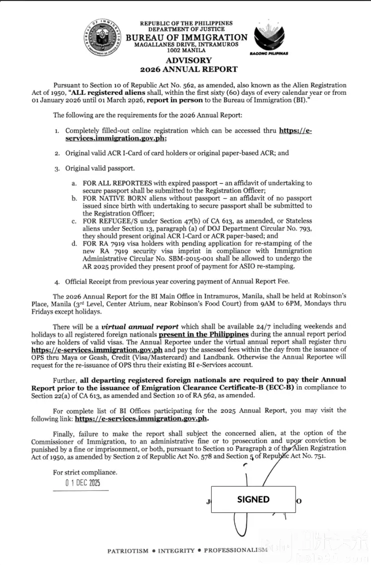 伯乐头条专讯:菲律宾移民局近期再度敲响“年度提醒钟”,宣布 2026 年度的外国人常年报到将正式启动。按照经修订的《第 562 号共和国法令》第 10 条规定,所有已登记的外国人都必须在每个日历年的前 60 天内完成亲自报到——换句话说,从 2026 年 1 月 1 日到 3 月 1 日这段时间,都得亲赴移民局“点名”,一个都不能漏。