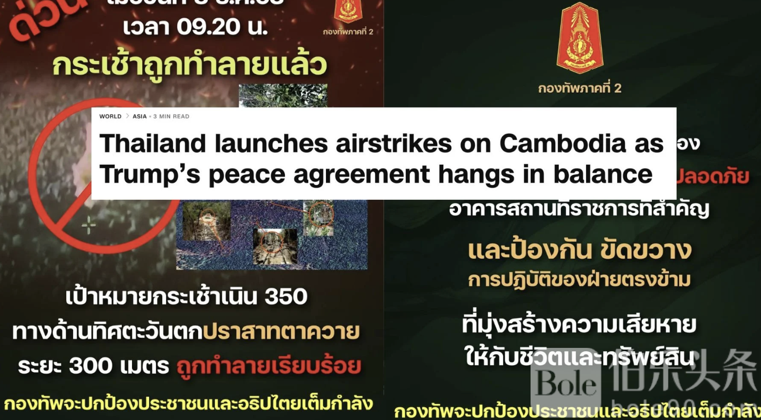伯乐头条专讯:泰国与柬埔寨边境局势于8日凌晨骤然升温,泰国皇家空军当天清晨对柬埔寨境内多处军事设施实施空袭,使得仅签署两个月的“特朗普和平协议”面临全面破裂风险。