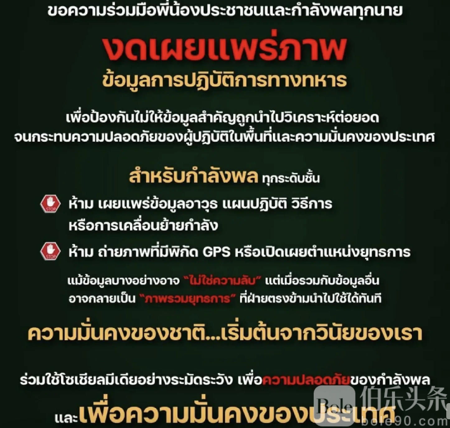 在战争阴影笼罩下,泰国第二军区通过官方平台发布严正提醒:所有民众及军方人员 不得拍摄、上传、转发 涉及武器装备、作战计划、部队机动路线等敏感资讯;特别强调 禁止发布带 GPS 定位的照片或影片,因为这类信息极易被敌方拼凑成清晰的作战布局,危及泰方官兵生命安全。