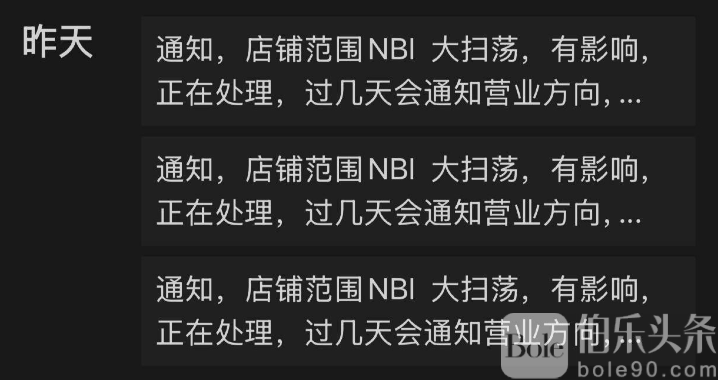 “通知:NBI 大扫荡,有影响,暂时停业。几天后通知方向。”