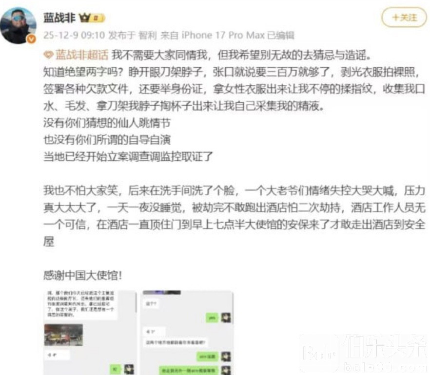 据蓝战非描述,绑匪早已通过贿赂机场与酒店工作人员掌握他的行程信息,并在夜间偷偷进入其房间,实施劫持和敲诈,逼迫其转账、配合网络贷款操作。绑匪甚至收集了他的指纹、毛发、口水及其他个人信息,并威胁称可通过买通当地警方伪造“强奸”案件,让其不敢报警。