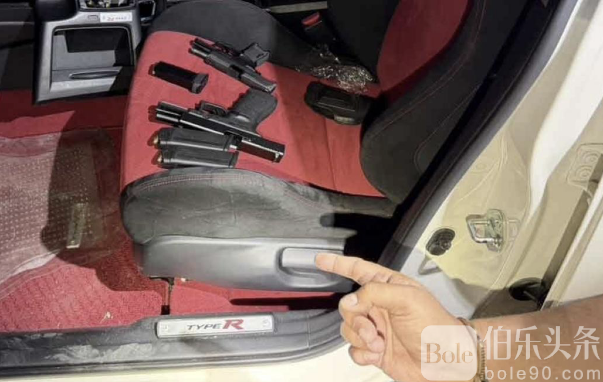 经详细搜查,警员在车内暗格中发现两把已上膛的半自动手枪,包括: