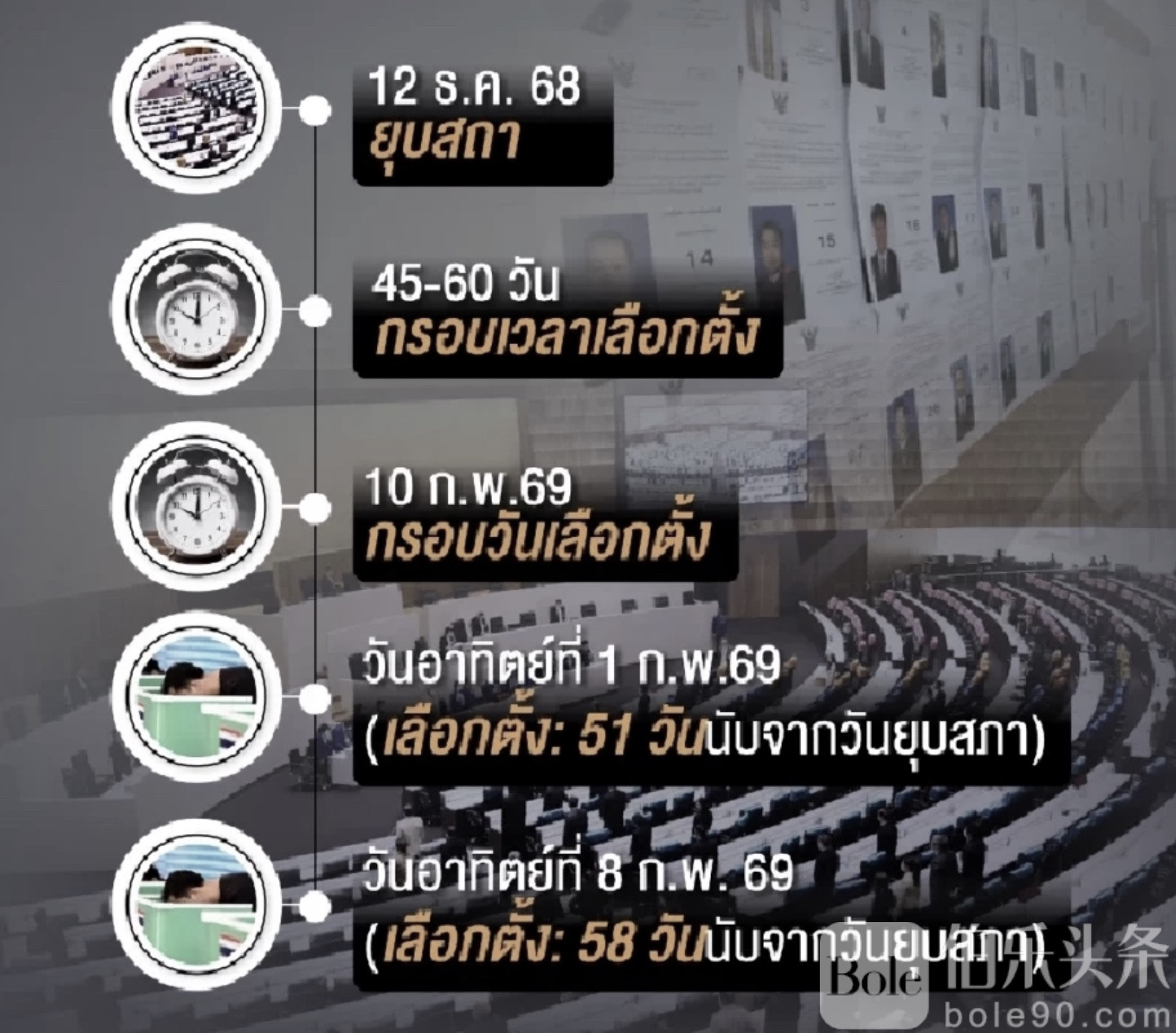 按照泰国法律,国会解散后必须在 45 至 60 天内举行选举,因此投票时间被限定在 2026 年 1 月 26 日至 2 月 10 日之间。不过,1 月 26 日虽符合法规,但当天是星期一——而泰国几十年来的选举日从未跳出“星期日”传统。这意味着实际可行的投票日只剩下两档:2026 年 2 月 1 日或 2 月 8 日。