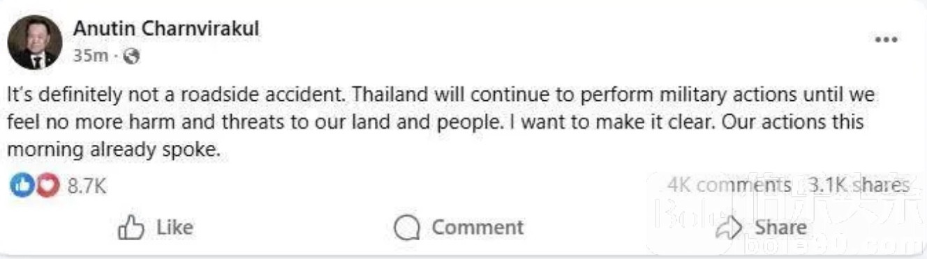在战场之外,政治层面的“温差”同样引人关注。当天上午,泰国总理阿努廷通过个人官方社交平台,强硬回应美国总统特朗普此前提出的“地雷意外论”。阿努廷直言,泰国士兵踩中地雷并非偶发事件,明确否认将其定性为“独立事故”的说法。