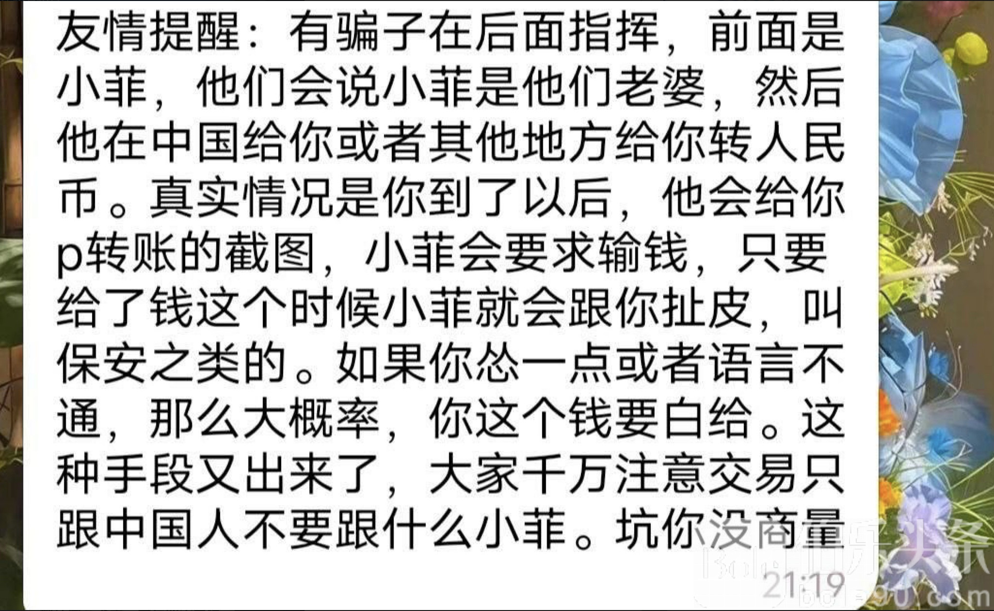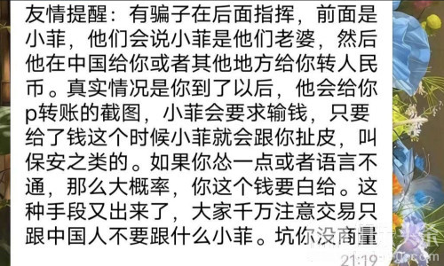 伯乐头条专讯:年底将至,菲律宾境内的换汇骗局又出现了新花样。据受害者反馈,一些骗子采取“远程指挥+前线小菲”的组合手法作案。他们会先声称小菲是骗子的“老婆”,然后通过中国或其他地区的账户向受害人转账人民币。表面上看似真实,甚至会提供伪造的支付截图,但一旦受害人上钩,小菲便会提出各种额外要求,甚至威胁或叫保安介入,如果你态度犹豫或语言不通,很可能血本无归。