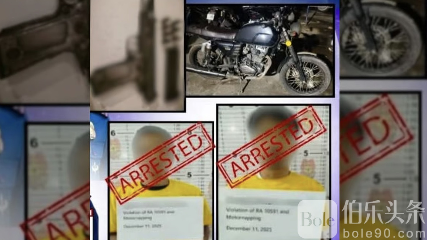 伯乐头条专讯:菲律宾警方近日在巴丹省马里韦莱斯市展开追捕行动,成功破获一起摩托车抢劫案,两名涉嫌“劫车”的男子被当场抓获,警方还在行动中起获一把已装填子弹的手枪,案件性质随之升级。