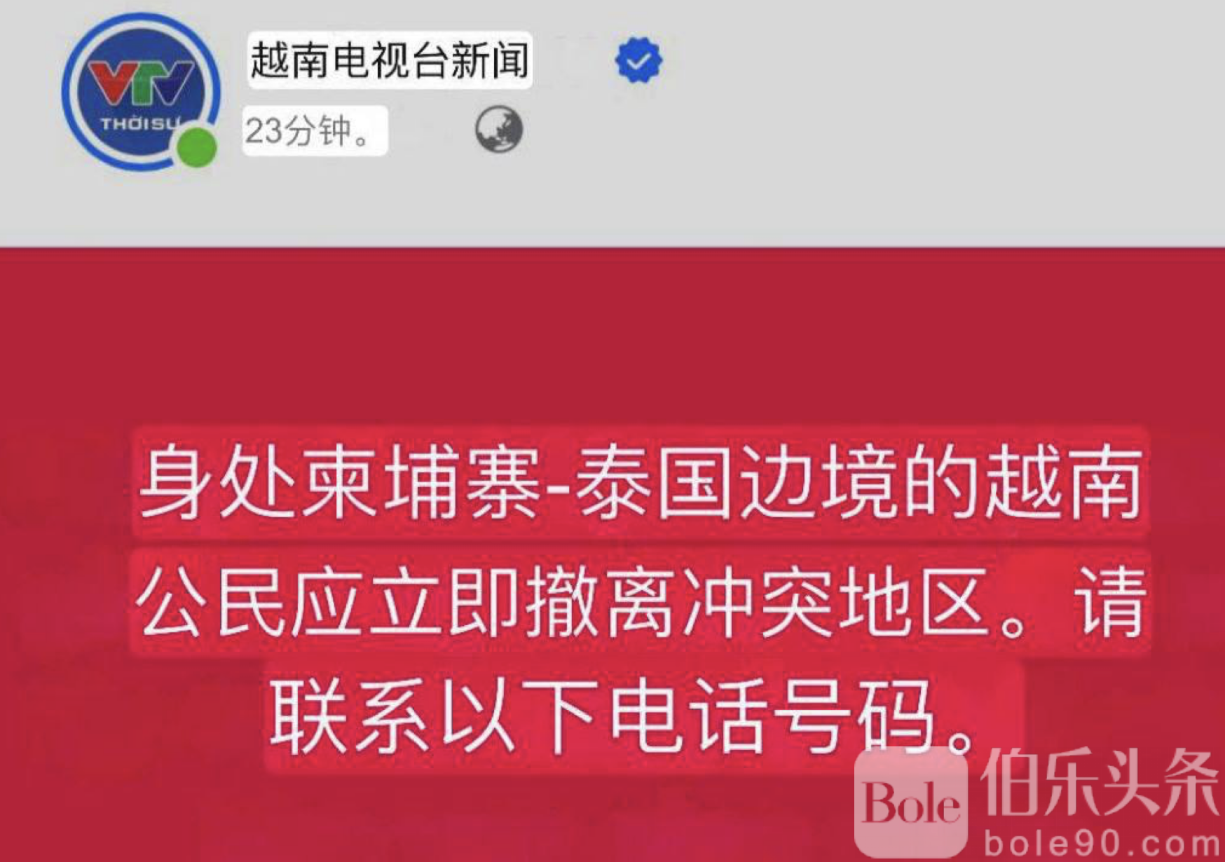 伯乐头条专讯:近日,越南驻外领事机构向在泰国—柬埔寨边境地区活动和居住的越南公民发出安全提醒,呼吁尽快撤离冲突区域,引发外界对东南亚局势是否进一步升级的高度关注。