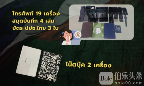 初步检查发现:现场查获手机19部、笔记本电脑2台、笔记本记录4本、银行账簿63本(均为泰国人名义)、泰国身份证3张,疑用于开设“马仔账户”,另外还查获10张ATM卡。