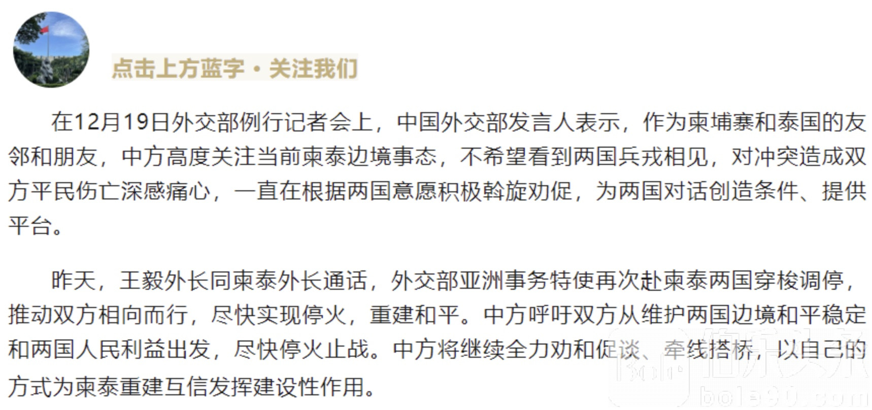 伯乐头条专讯:中国外交部日前证实,自12月18日起,中国外交部亚洲事务特使已再次启程,赴柬埔寨、泰国开展穿梭调停,积极斡旋当前紧张的柬泰边境局势,推动双方尽快停火止战,重回对话与和平轨道。