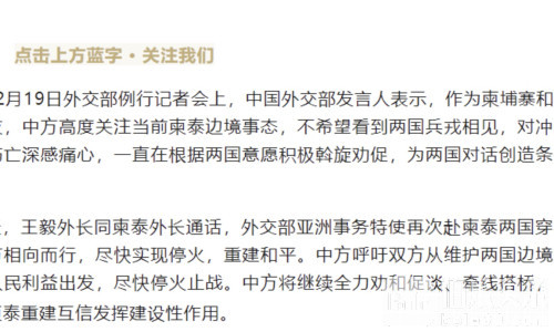 在12月19日举行的外交部例行记者会上,发言人表示,中方作为柬埔寨和泰国的友邻与朋友,高度关注近期边境事态发展。中方不愿看到局势升级,更不希望冲突扩大至兵戎相见,对由此造成的平民伤亡深感痛心。基于两国意愿,中方一直在以务实方式积极劝和促谈,为双方对话创造条件、搭建平台。