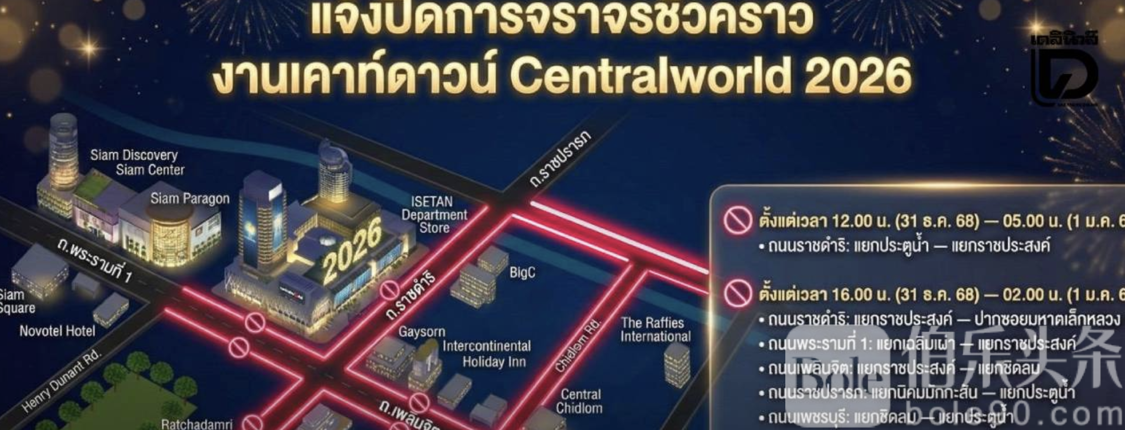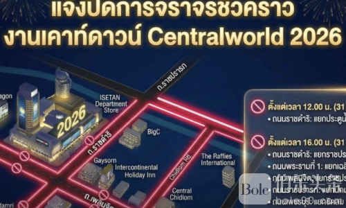 伯乐头条专讯:曼谷警方宣布,为配合2026年中央世界跨年倒数活动,市中心多条主要道路将于12月31日中午12时至1月1日凌晨5时实行临时交通管制。此次封路范围涵盖拉差帕宋至帕图南区域的多条核心街道,旨在确保大型节庆活动顺利进行,并保障市民安全。