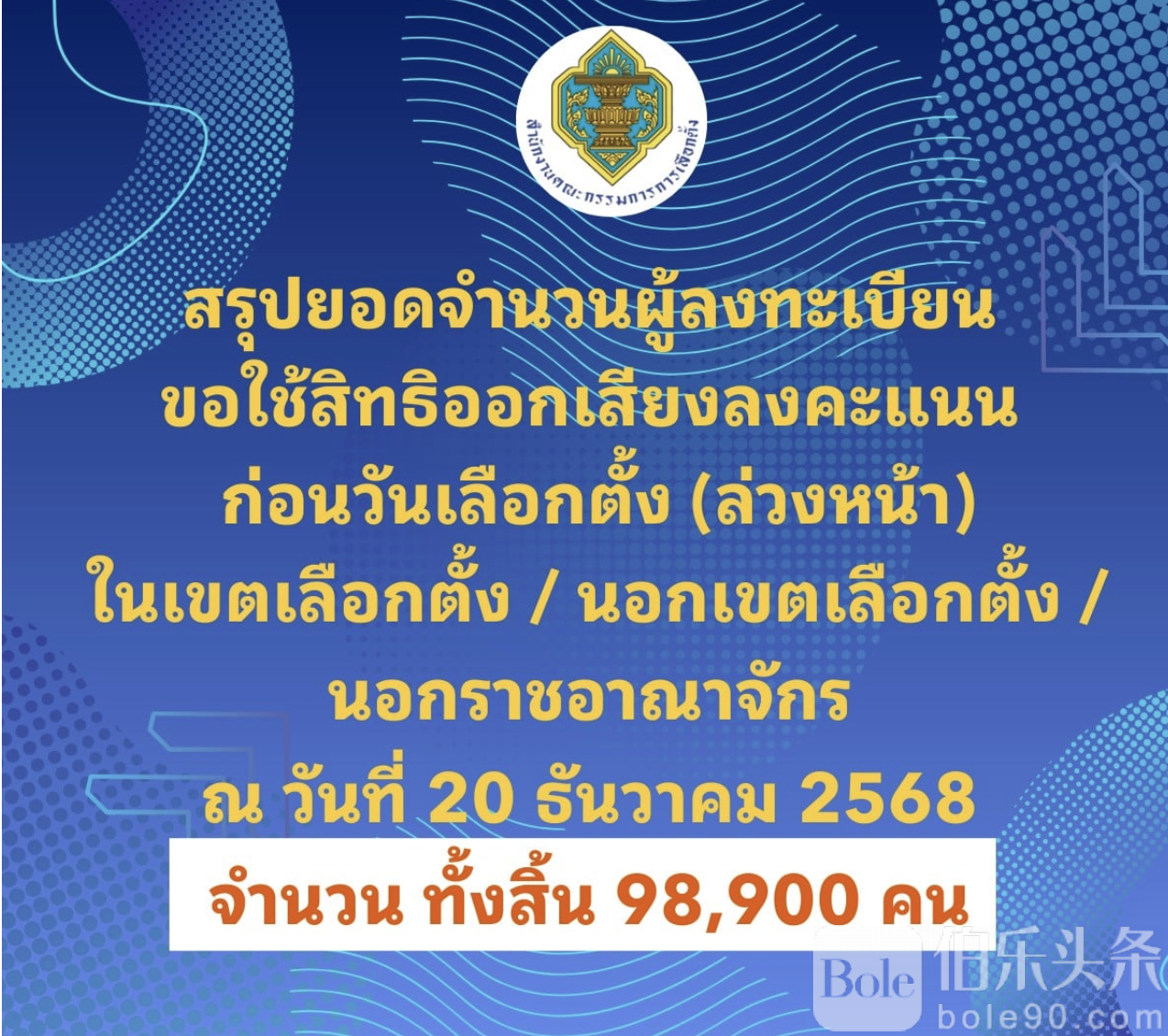 伯乐头条专讯:泰国选举委员会(กกต.)21日公布数据显示,2025年12月20日提前投票登记首日,共有98,900名泰国公民完成登记,涵盖境内、境外及海外登记选民。具体数据为:境内选区登记48人、非选区登记90,491人、海外登记8,361人。