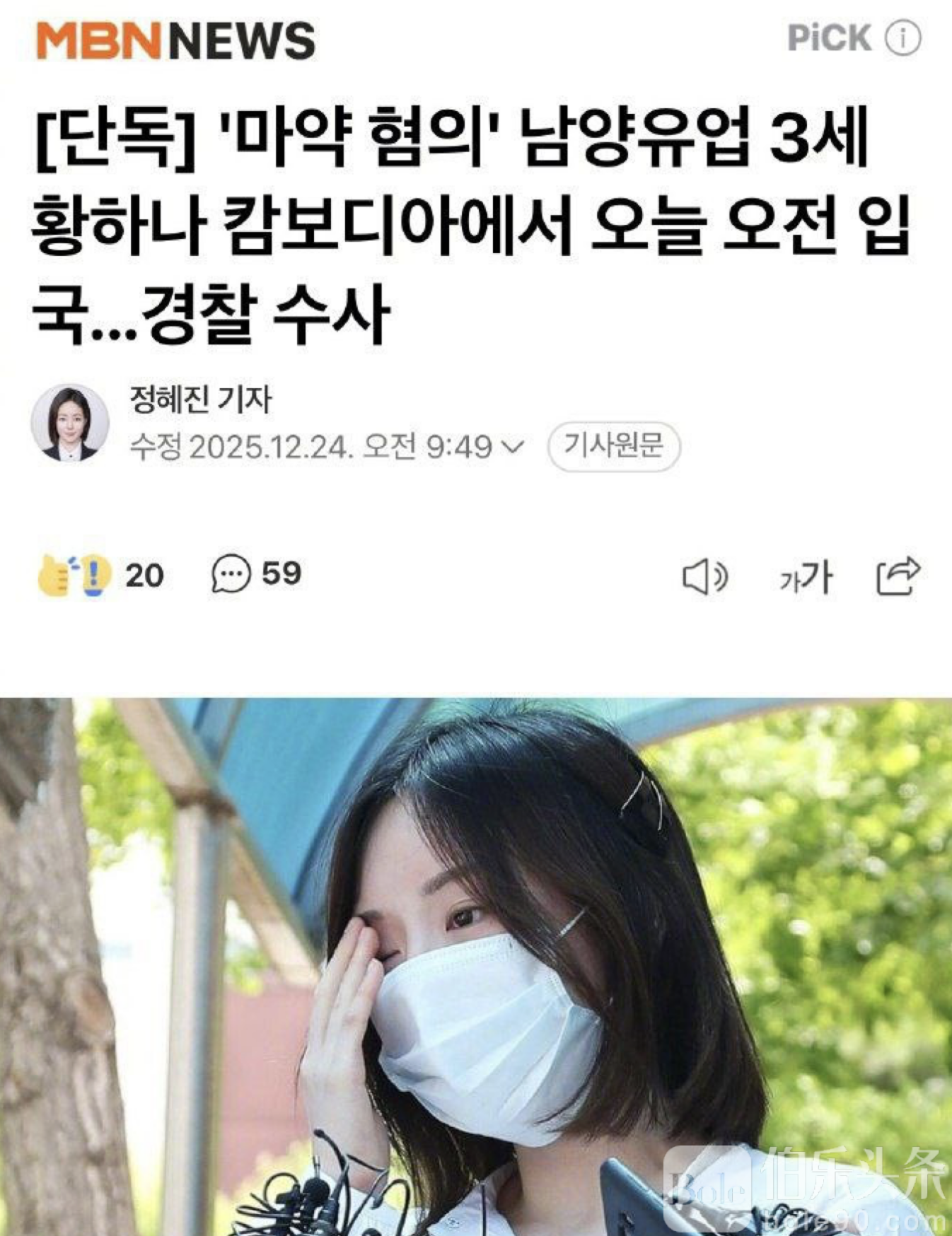 伯乐头条专讯:韩国司法部与相关执法机构今日通报,因长期涉毒并曾逃避判决的财阀千金黄荷娜,凌晨在柬埔寨机场被当地警方依法拘捕,并于当天上午7点50分顺利押回韩国接受调查。官方强调,本案将严格依据韩国法律追究其刑事责任,任何跨国逃逸行为均不能规避法律制裁。