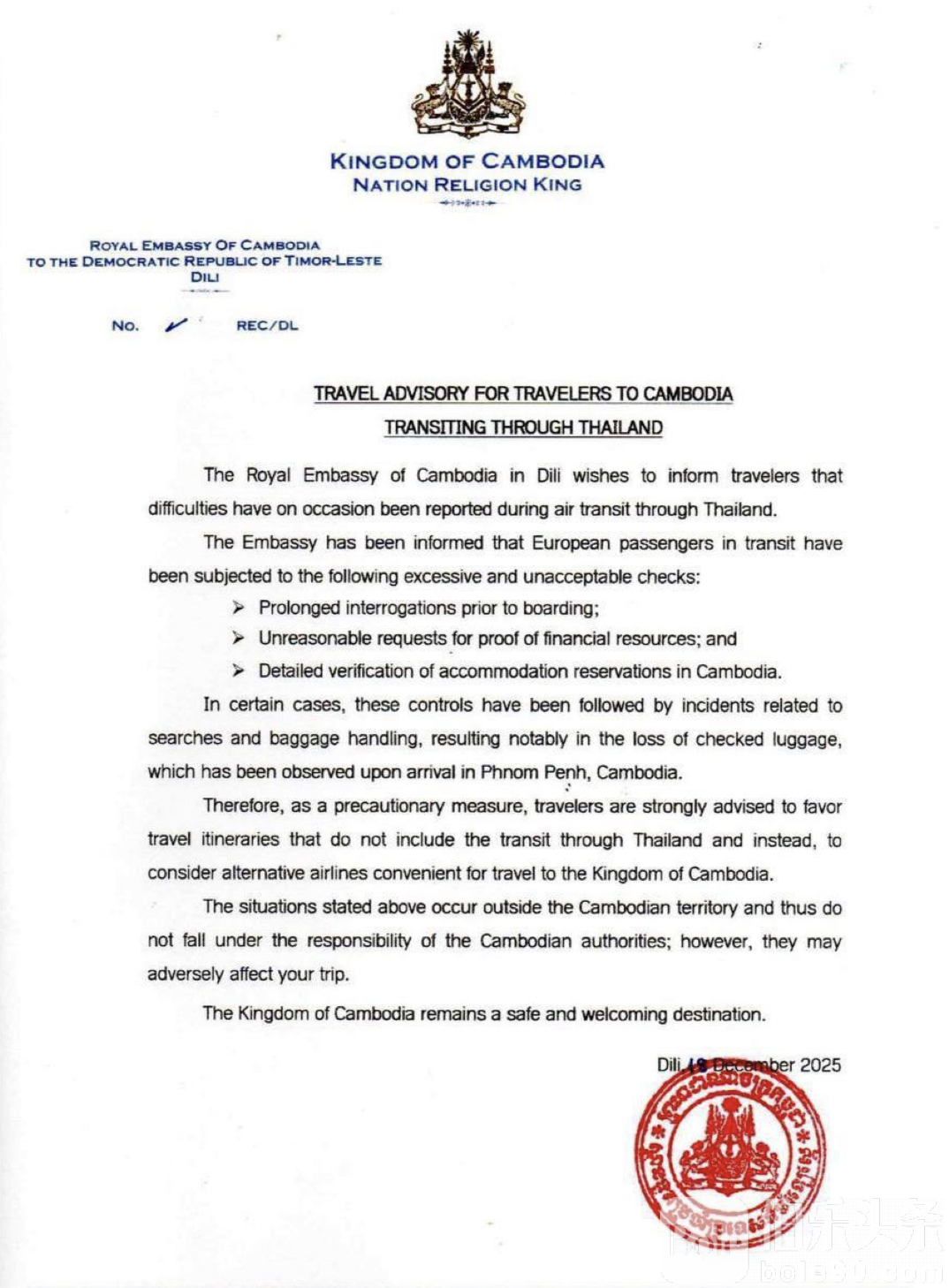 伯乐头条专讯:柬埔寨外交部近日向所有驻外使领馆及代表机构下达紧急通知,提醒柬埔寨公民及外国旅客在近期暂时避免经由或过境泰国前往柬埔寨。官方同时宣布,作为临时性措施,将暂停使用泰国航空公司的航班服务。