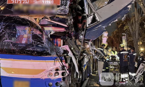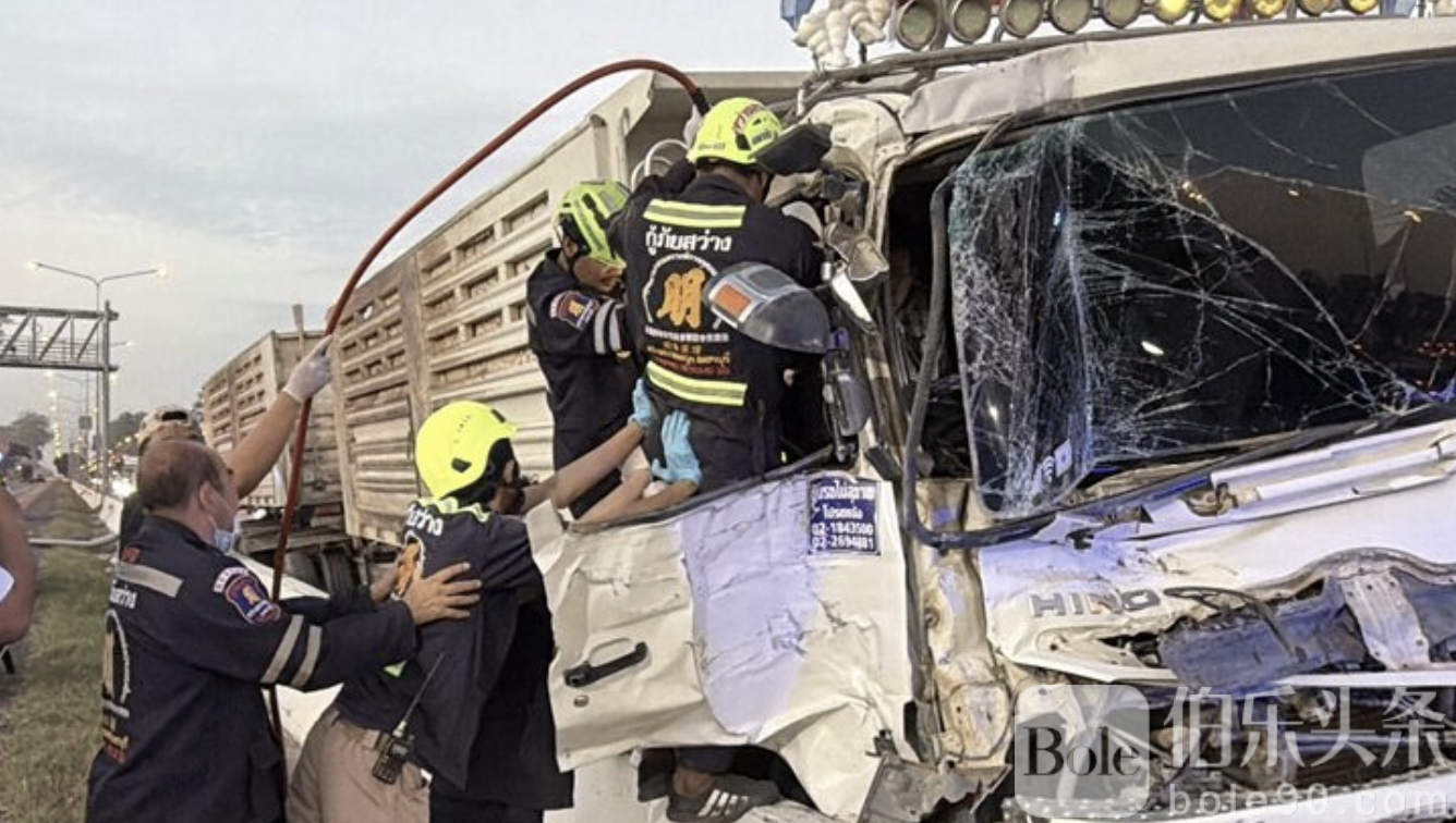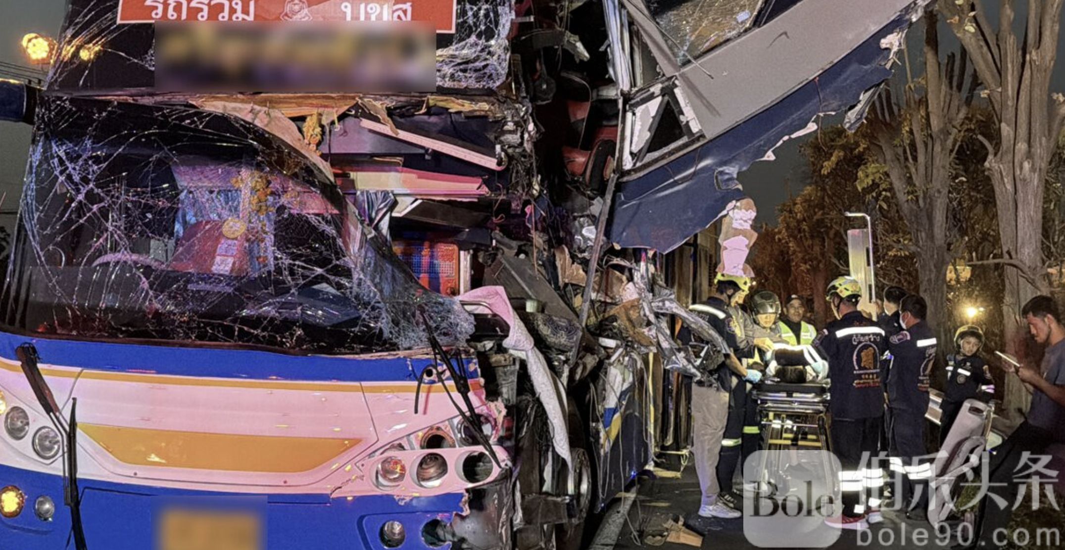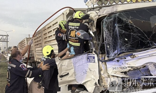 伯乐头条专讯:泰国佩特查布里省27日凌晨,发生一起严重交通事故,一辆蓝白色客运巴士高速追尾一辆满载货物的十轮卡车,造成车上十多名乘客受伤,其中一人被撞飞穿过车窗,伤势严重。事故发生在前往曼谷的佩特查布公路162公里+425处。