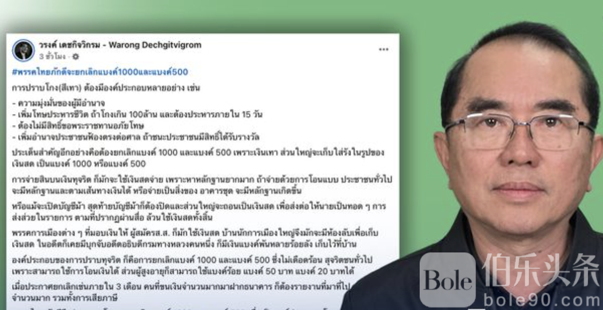 伯乐头条专讯:12月26日泰国爱国党党魁兼总理候选人诺帕·瓦朗科(นพ.วรงค์ เดชกิจวิกรม)近日在社交平台宣布,该党将提出废止500铢和1000铢钞票,以遏制灰色腐败与非法现金流。