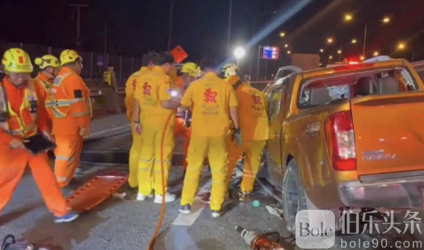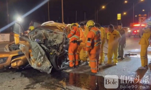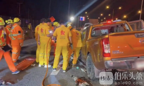 伯乐头条专讯:清晨4点,一起惨烈车祸在泰国春武里府摩托路发生,一辆橙色日产纳瓦拉皮卡迎头撞上停靠在路边的18轮白色货运卡车,现场瞬间血光四溅,4人当场死亡,1人奇迹生还。