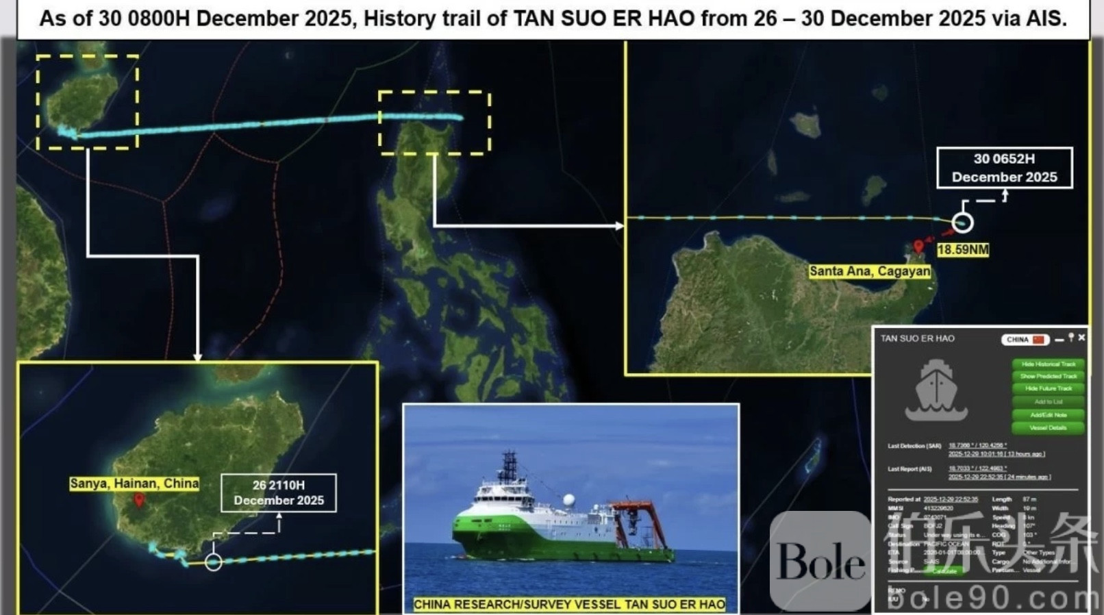 菲律宾海岸警卫队西菲律宾海发言人杰伊·塔里埃拉称,这艘名为“探索二号”的中国科研船,被加拿大的暗船侦测系统发现进入菲律宾专属经济区。对此,中国大使馆提供了现场音频,显示中国舰船曾对遇险菲律宾渔民进行人道援助,并驳斥塔里埃拉“未沟通”的指控,甚至建议其核实基本事实后再发言。