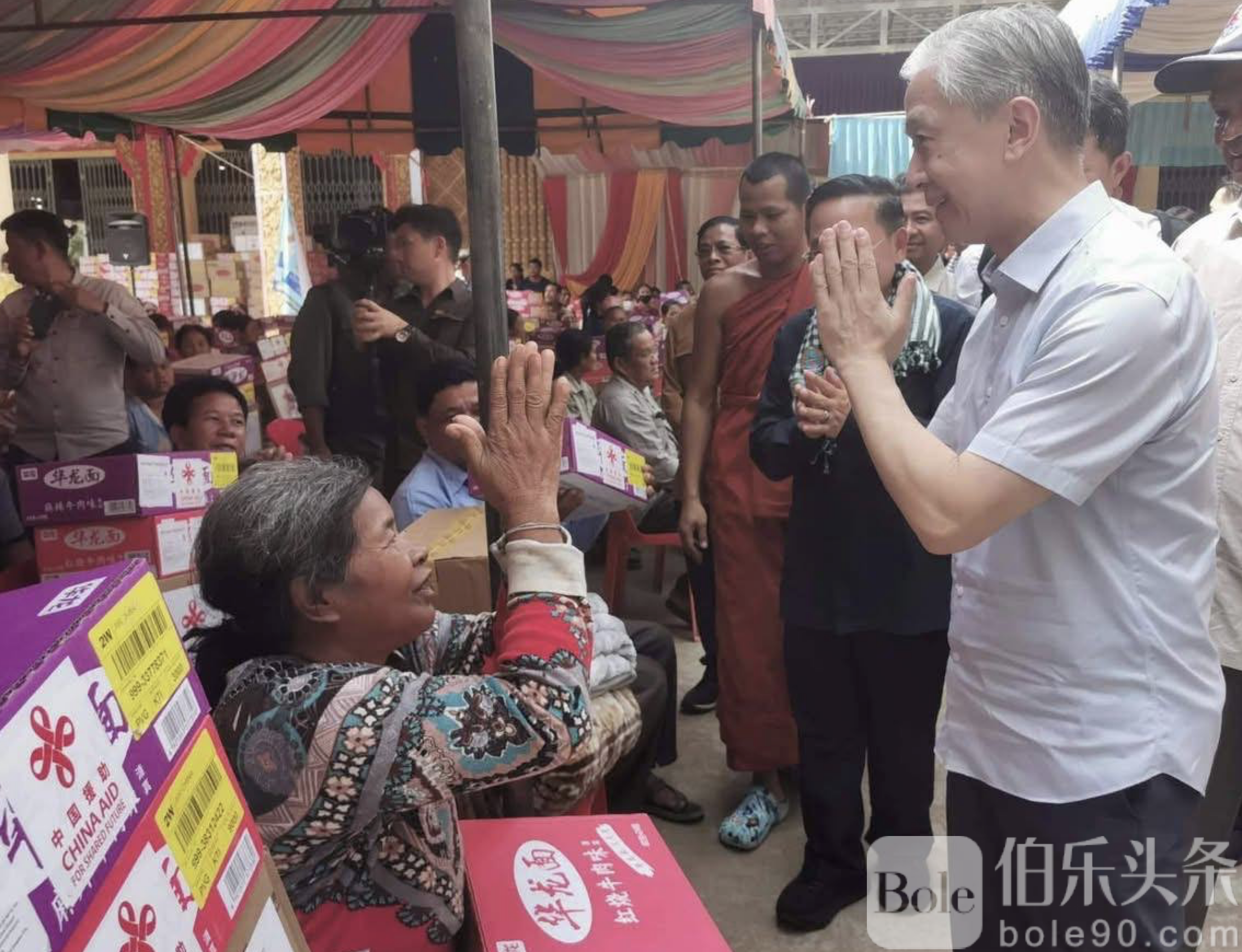 伯乐头条专讯:中国驻柬埔寨大使汪文斌近日与柬埔寨国家灾害管理委员会第一副主席金坤一道,前往卜迭棉芷省与马德望省,向当地因边境局势和安全风险而流离失所的平民发放中国政府提供的首批紧急人道主义援助物资。
