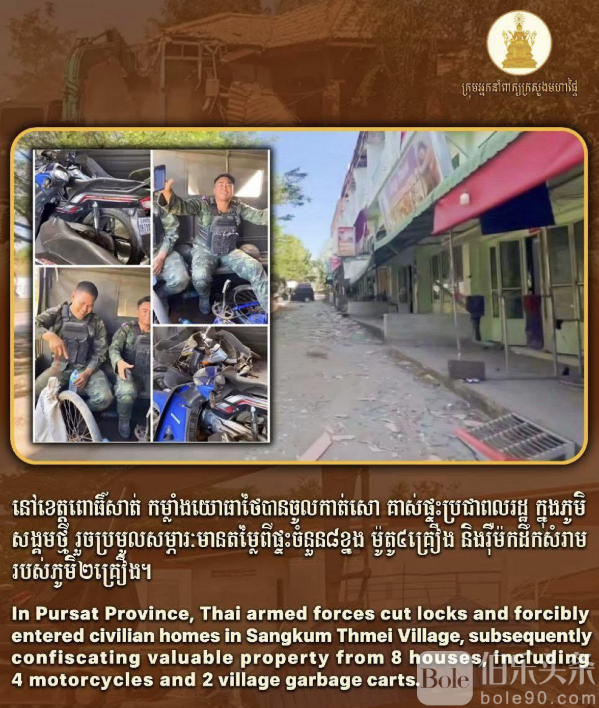 伯乐头条专讯:1月4日柬埔寨菩萨省新社会村发生争议性事件,柬埔寨内政部指控泰国武装部队在该村行动中,剪断民宅门锁强行进入8栋平民住宅,并搜掠屋内财物。据官方通报,事件中共被掠走4辆摩托车以及2辆归属村集体的垃圾车。