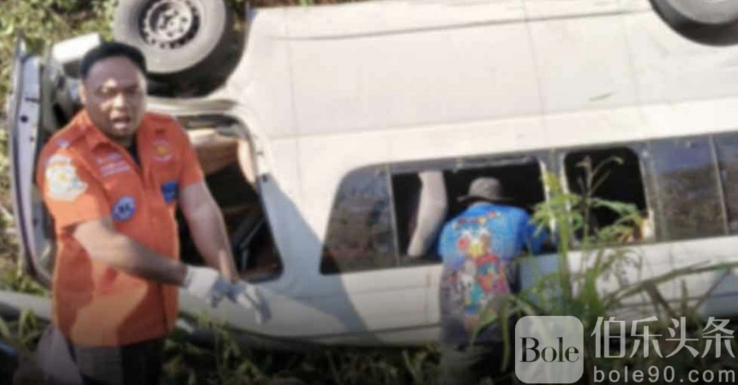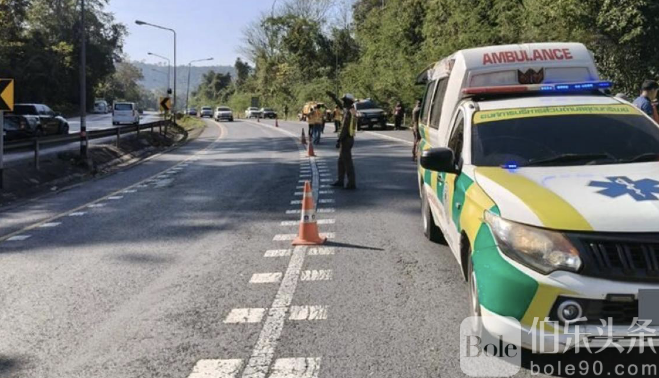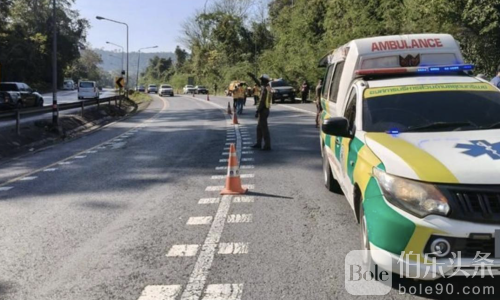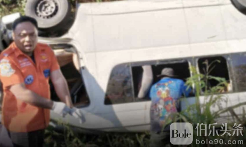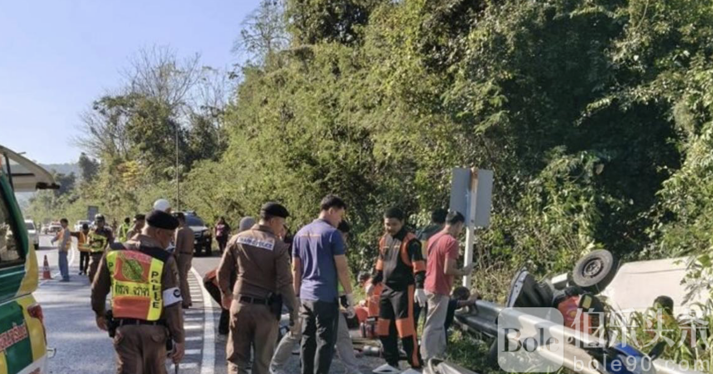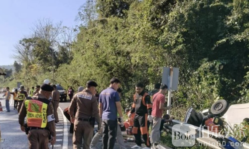 伯乐头条专讯:1月5日上午,泰国呵叻府旺南乔县304号公路发生严重交通事故,一辆载客面包车在下坡弯道转弯时失控,撞上护栏后翻车坠入山坡,导致2人当场死亡,14人不同程度受伤,其中部分伤者一度被困车内。