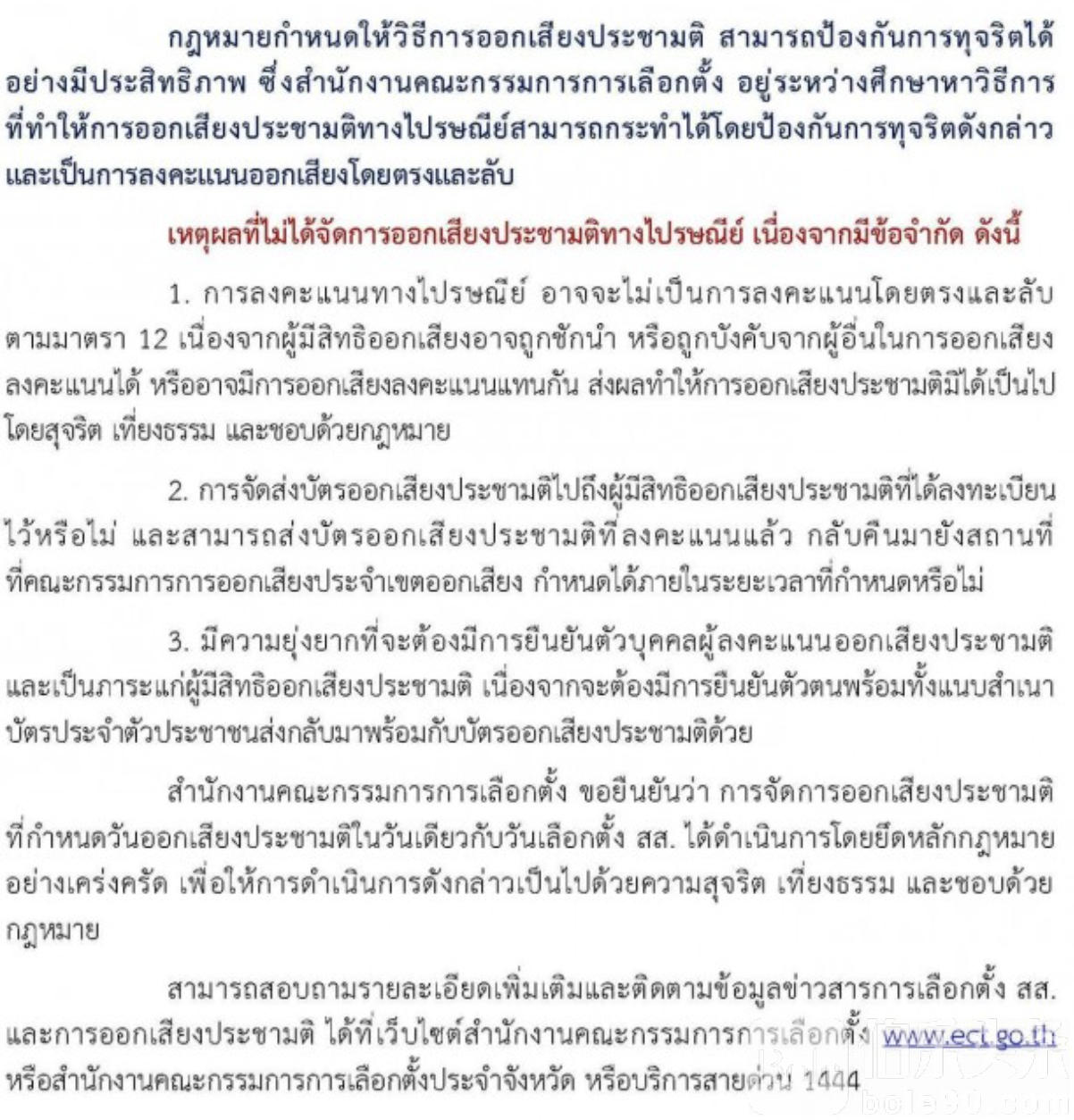 选民可通过泰国选举委员会官方网站、各府选委会办公室,或拨打1444热线查询最新选务与公投资讯。