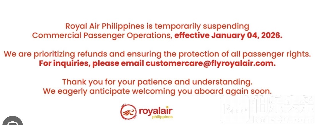 伯乐头条专讯:菲律宾航空市场再起波澜。自1月4日起,菲律宾皇家航空(Royal Air Philippines)正式停飞全部商业客运航班。这意味着,一家在菲律宾扎根二十余年、拥有中资背景的航空公司,在多重现实压力叠加之下,按下了“暂停键”。