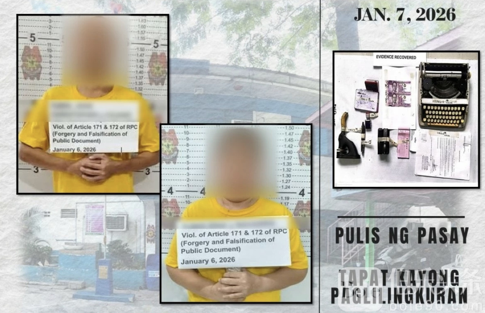 据帕赛市警察局局长德塞斯托(Joselito De Sesto)上校介绍,1月6日,市警情报组在巴朗盖70区帕萨迪纳街实施执法行动,抓获41岁的“JC”(化名,男,文员)和60岁的“Ina”(化名,女,秘书)。两人均来自奎松市,被指长期在帕赛市政厅附近“接单”,从事非法公证业务。