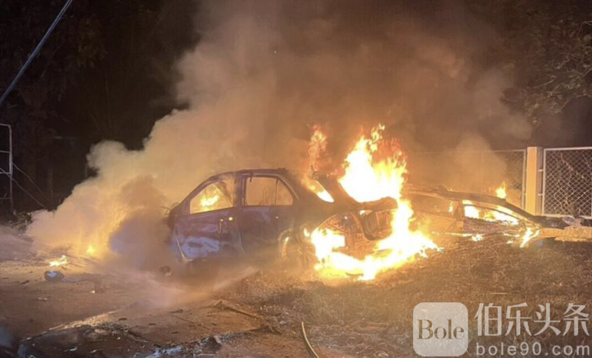 伯乐头条专讯:泰国汶干府(Bueng Kan)塞卡县今晨发生一起严重交通事故。一辆白色奔驰轿车在凌晨行驶途中突然失控,接连撞断5根高压电线杆,车辆随即起火焚毁,驾驶人伤重不治,事故还一度导致城区大范围停电。