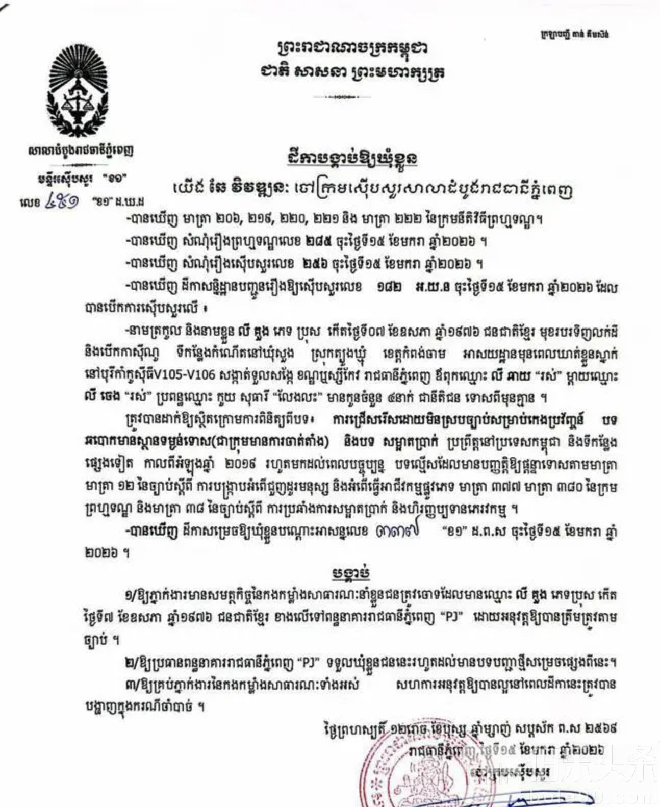 伯乐头条专讯:柬埔寨反电诈风暴再落重锤。金边市初级法院法官于1月15日签发拘押令,裁定对涉嫌重大电信网络诈骗案件的嫌疑人黄继茂勋爵实施羁押,并将其暂押于金边市白梳监狱(PJ),等待后续司法程序推进。