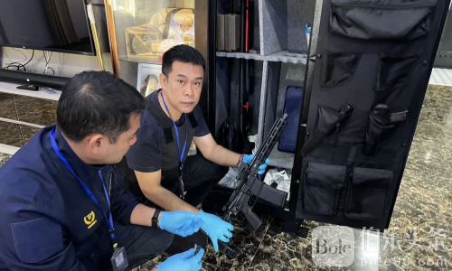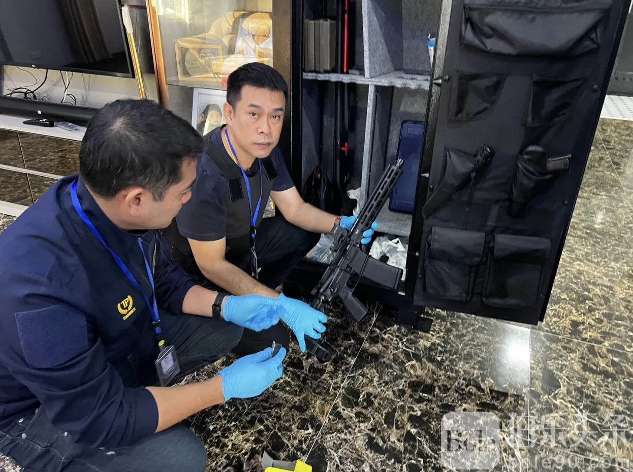 伯乐头条专讯:泰国网络警察近日在佩武里府展开专项行动,成功捣毁一处非法枪械存放窝点,现场查获多支枪械及大量弹药。一名年轻女子被当场拘捕,而案件线索,竟源自其丈夫在社交平台高调晒枪的行为。