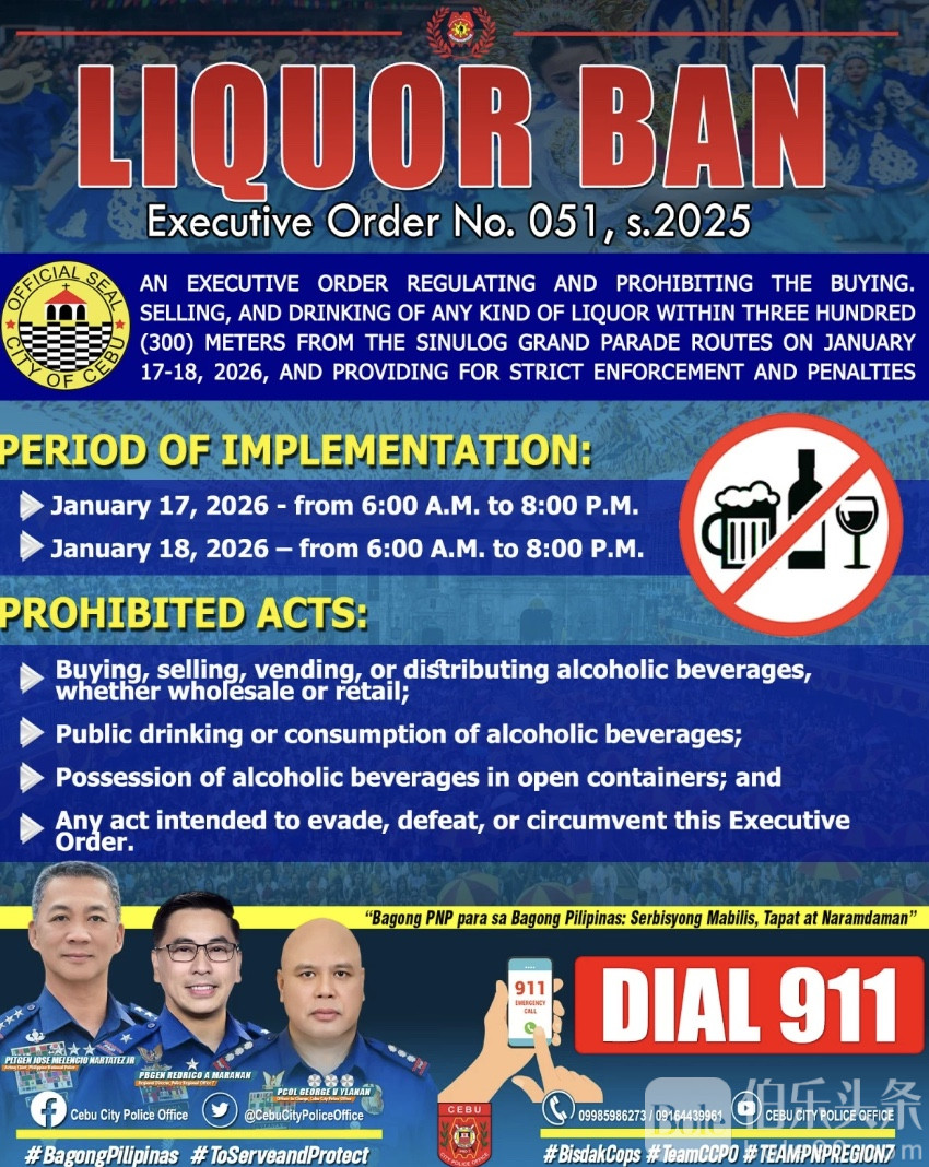 伯乐头条专讯:为确保一年一度的圣婴节(Sinulog)大巡游安全、有序进行,菲律宾宿务市政府宣布,将在巡游前一天及活动当天,对相关区域实施临时禁酒措施。宿务市市长内斯托·阿奇瓦尔(Nestor Archival)已正式签署第051号行政命令,对巡游沿线周边实施酒类销售与饮用限制。