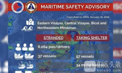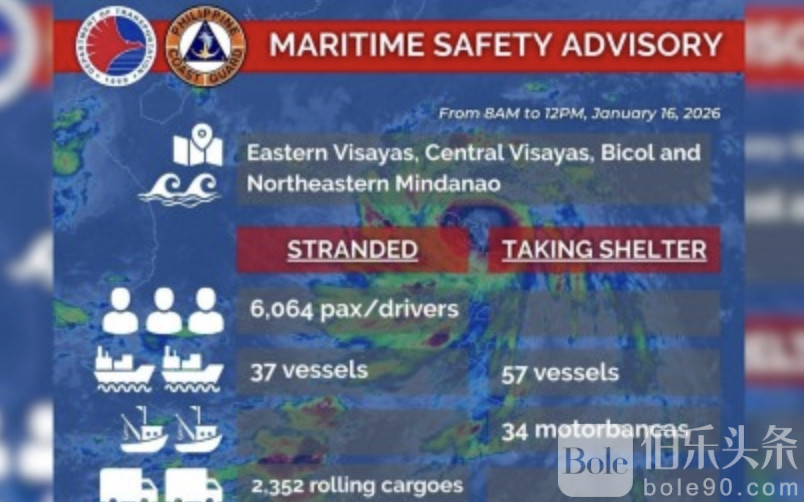 伯乐头条专讯:受热带风暴“艾达”(Ada)持续影响,菲律宾多地海况恶化,港口通航受阻,大量人员和货物被迫滞留。菲律宾海岸警卫队(PCG)16日通报,全国已有超过6000名旅客、2000多辆滚装货车以及数十艘船只被困在各地港口,短期内出行与物流压力明显加大。